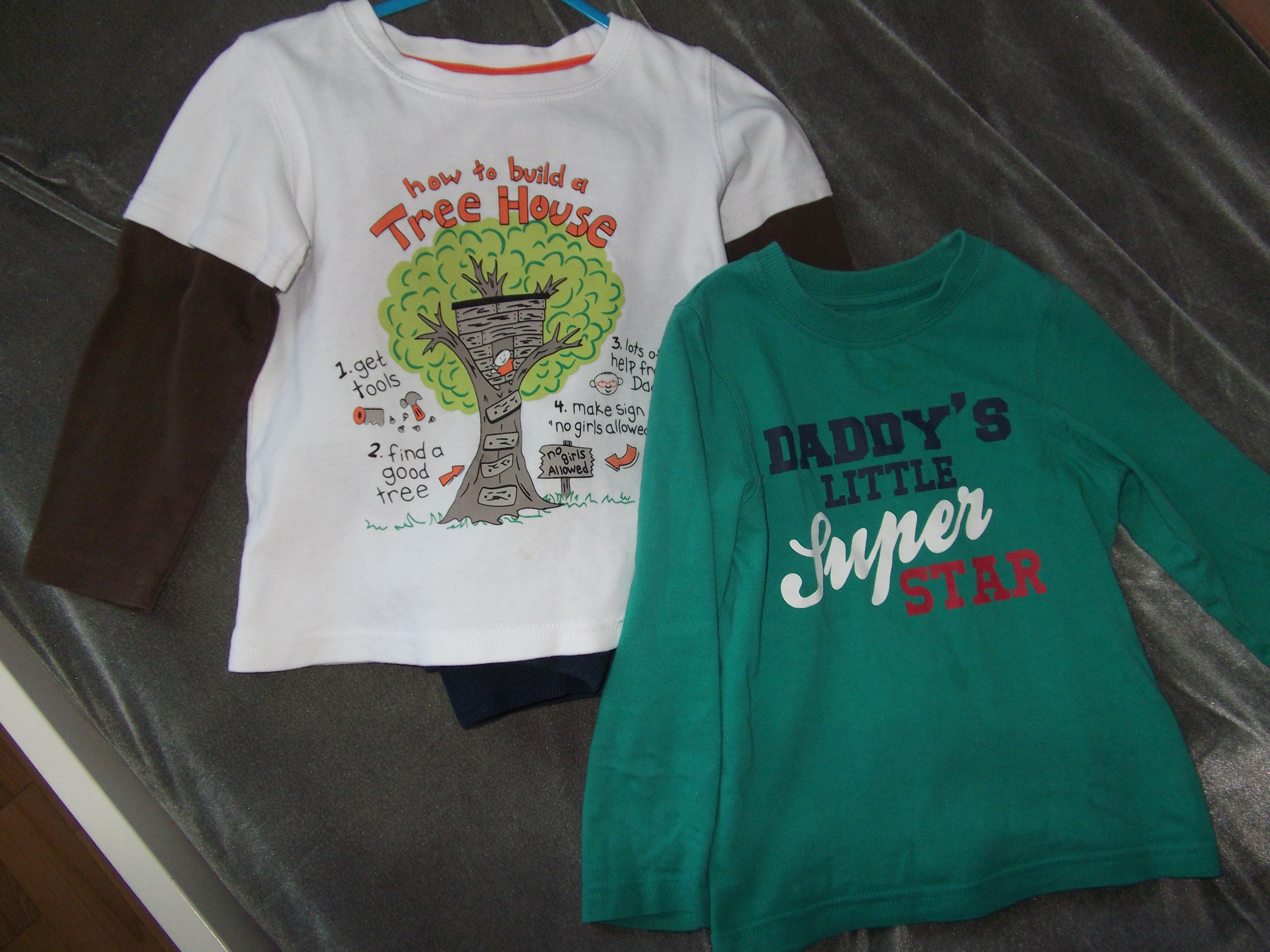 Белый лонгслив с коричневыми рукавами более плотный х/б трикотаж, чем у зеленой (рисунок "Дерево" очень устойчивый к стирке) на возраст 2-3 года. Замеры: длина 33, ширина 31, рукав 31, 150 руб.